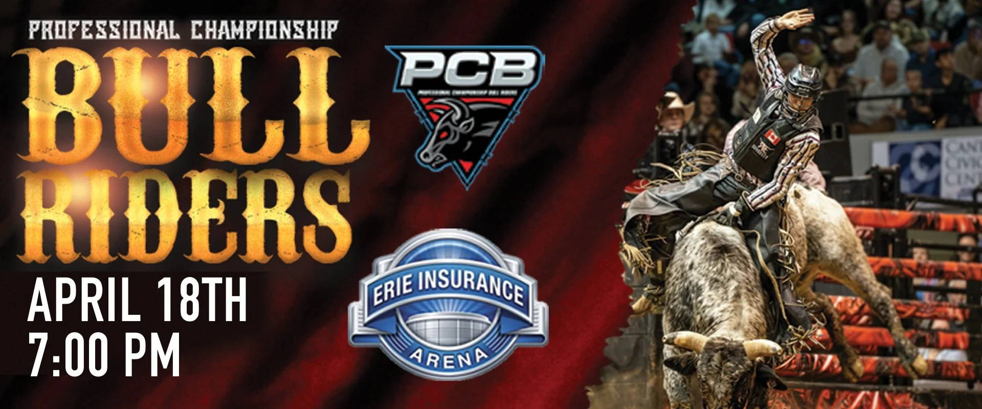 Back to All Events Professional Championship Bull Riders — Boot Barn Invitational Saturday, April 18, 2026 7:00 PM 10:00 PM Erie Insurance Arena 809 French Street Erie, PA, 16501 United States (map) Google Calendar ICS Experience the Professional Championship Bull Riders — Boot Barn Invitational: world-class bull riding, fast-action barrel racing, music, lights, and nonstop adrenaline. Great for families and groups.